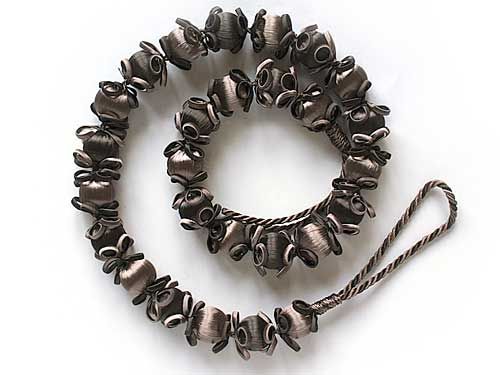Подхват для штор "Ажурный" состоит из бусин, обтянутых цветной нитью, и маленьких бантиков. Он очень пластичен, хорошо сворачивается и красиво повисает, если нужно слегка присобрать портьеры.