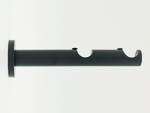 Прямой двухуровневый кронштейн для карнизов на основе простых металлических труб подходит для большинства современных дизайн-проектов. Обратите внимание, что в зависимости от пратии величина вылета от стены может меняться.