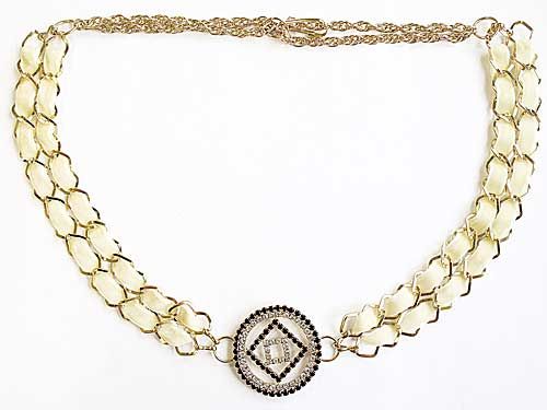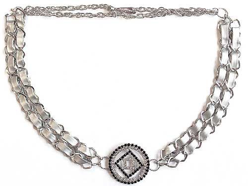 В основе подхвата - металлическая цепь с вплетенной в нее лентой из искусственной замши. Изделие украшено по центру медальном с геометрическим рисунком, отделанным стразами. Аксессуар очень пластичный, красиво лежит на портьере, напоминает элегантную женскую бижутерию.