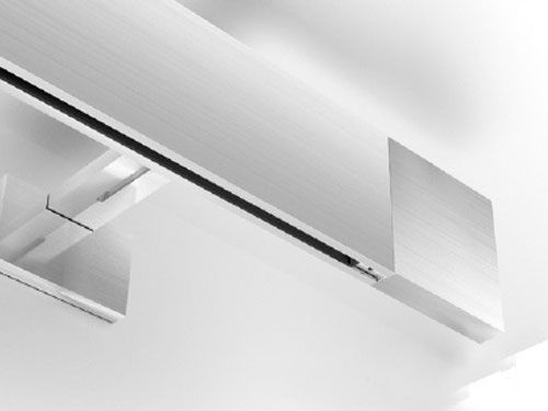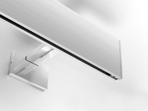 Открытая профильная система монтируется на стену или потолок. При потолочном креплении заказываются небольшие угловые кронштейны стального цвета, при настенном - настенные кронштейны, которые могут быть окрашены в цвета белый глянец, черный(матовый), черный глянец или сталь.